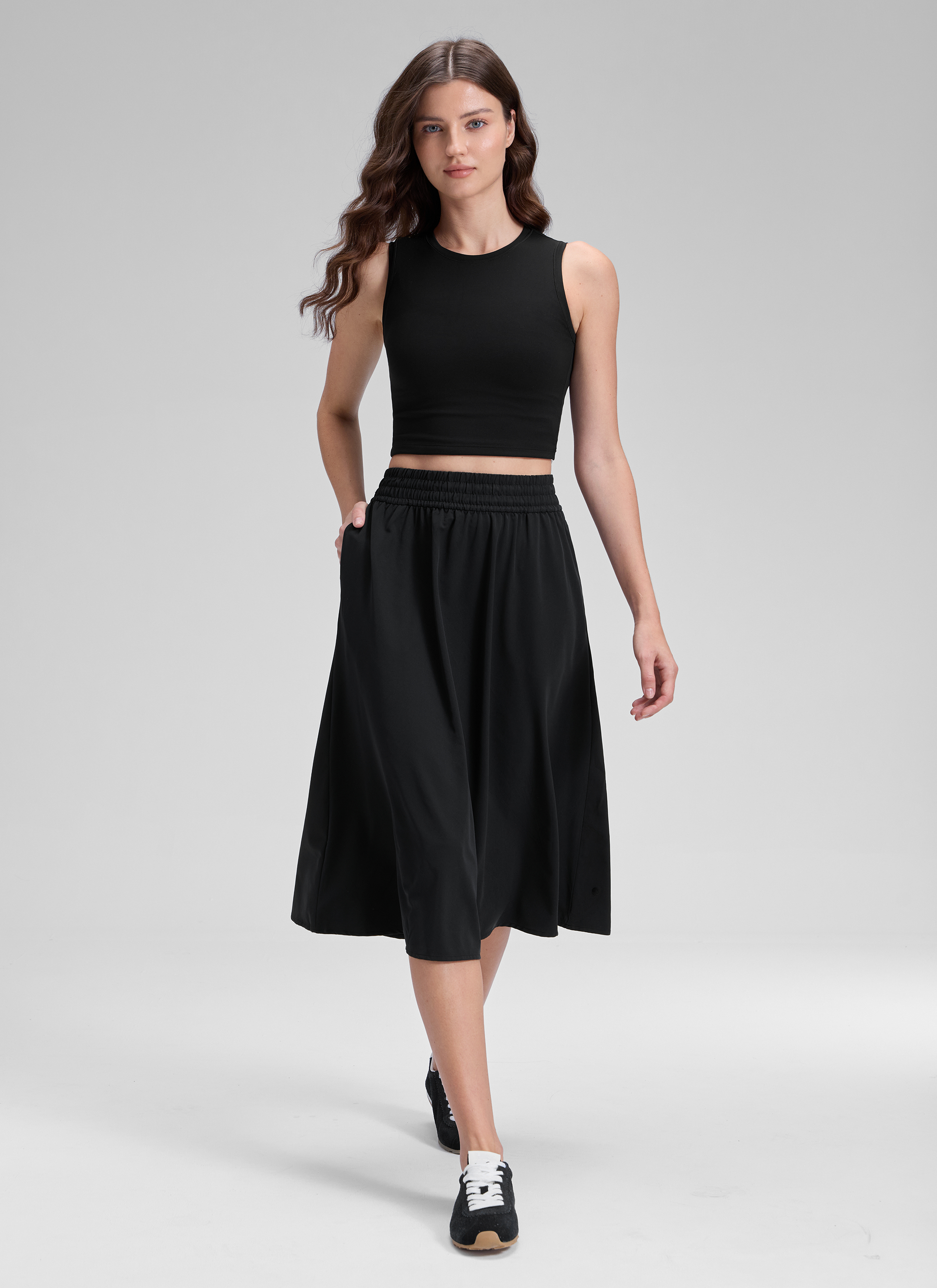 Crafted from breathable and weightless fabric, this below-knee skirt combines effortless elegance with a flared silhouette—perfect for elevating your style on any occasion.